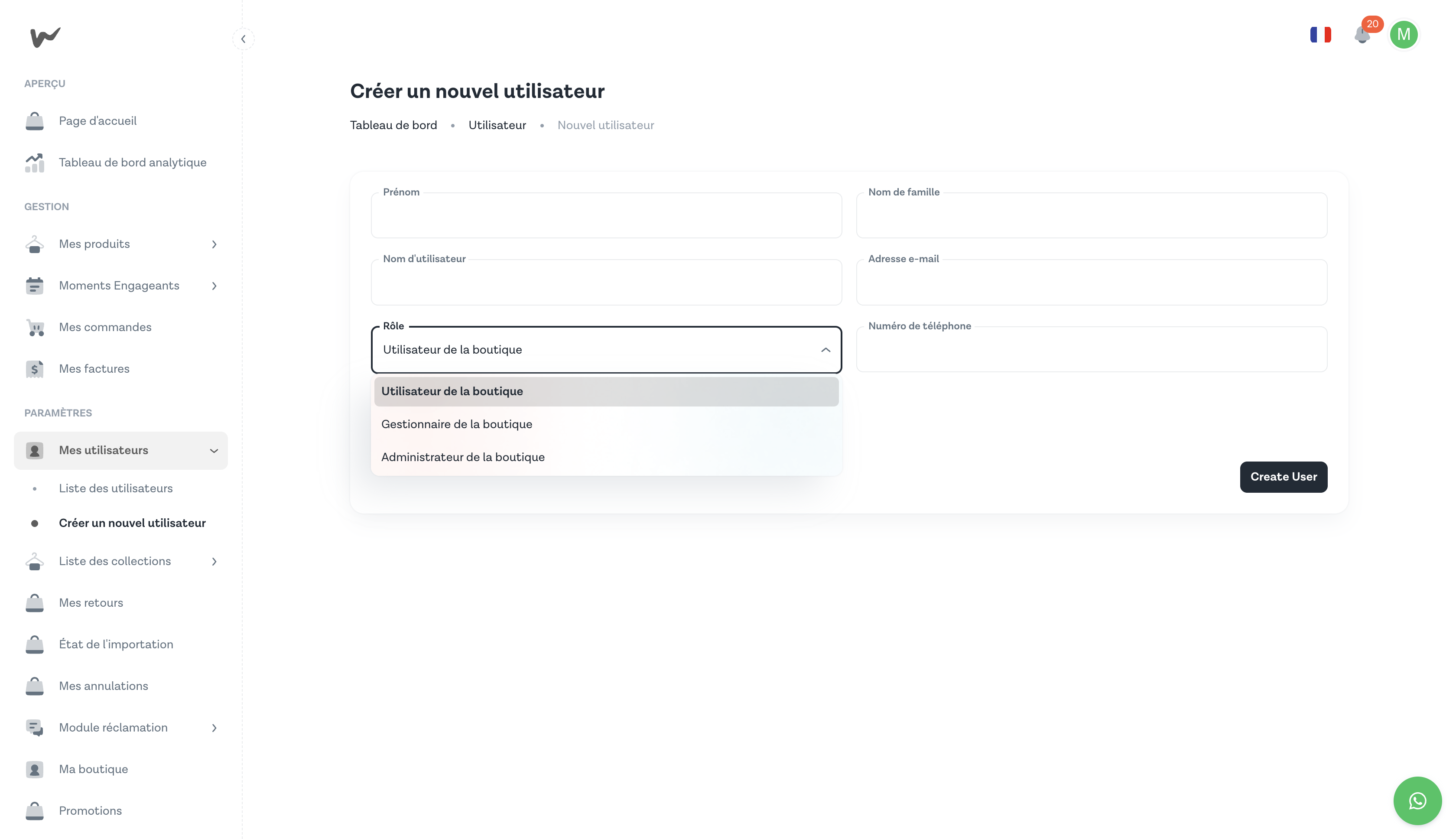 Vous devez être connecté avec un compte ayant le rôle Administrateur de la boutique. Seul ce rôle peut créer et gérer les utilisateurs.