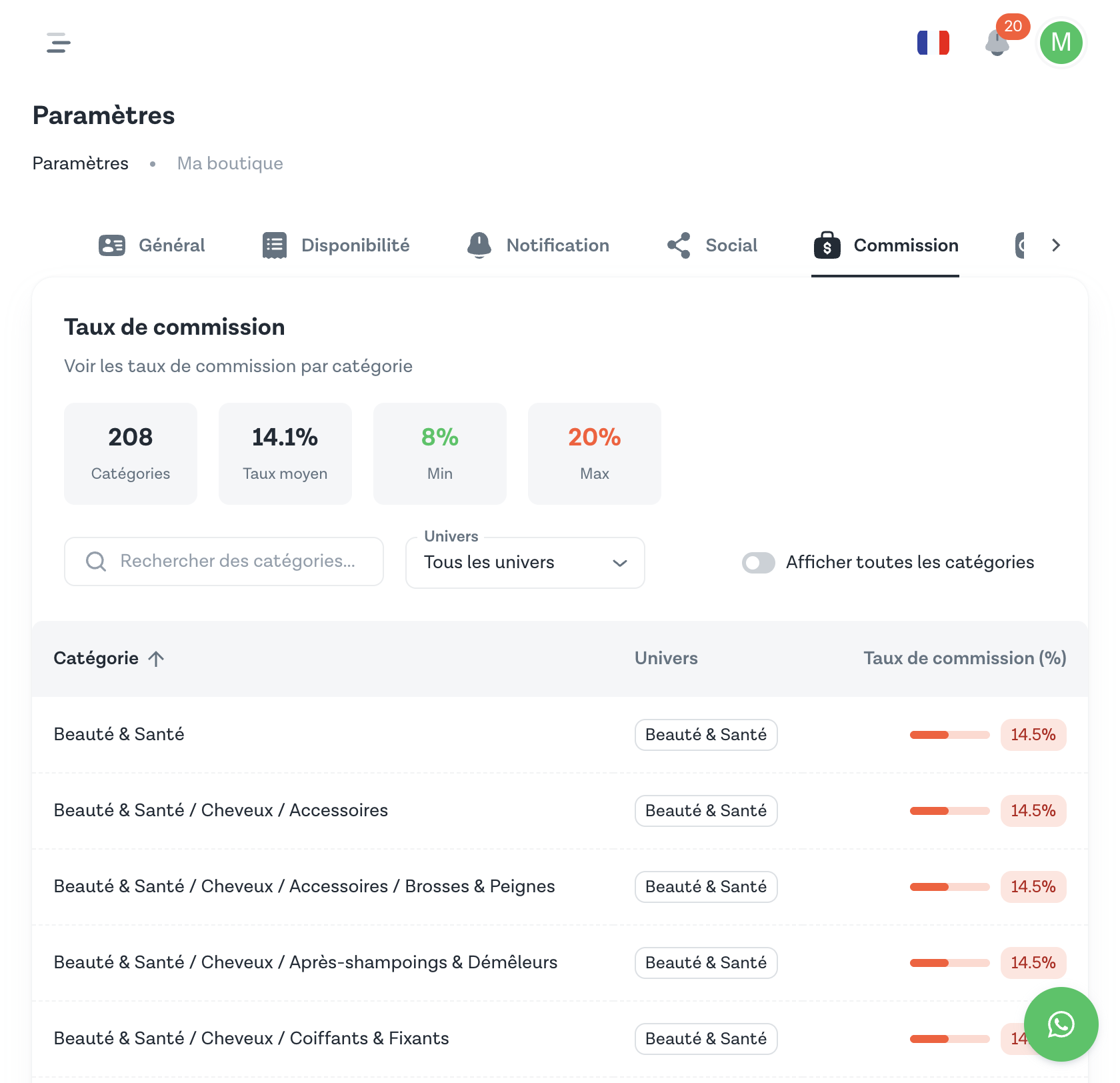 Dans le portail vendeur, cliquez sur Ma boutique dans le menu gauche, puis sélectionnez l'onglet Commission.
