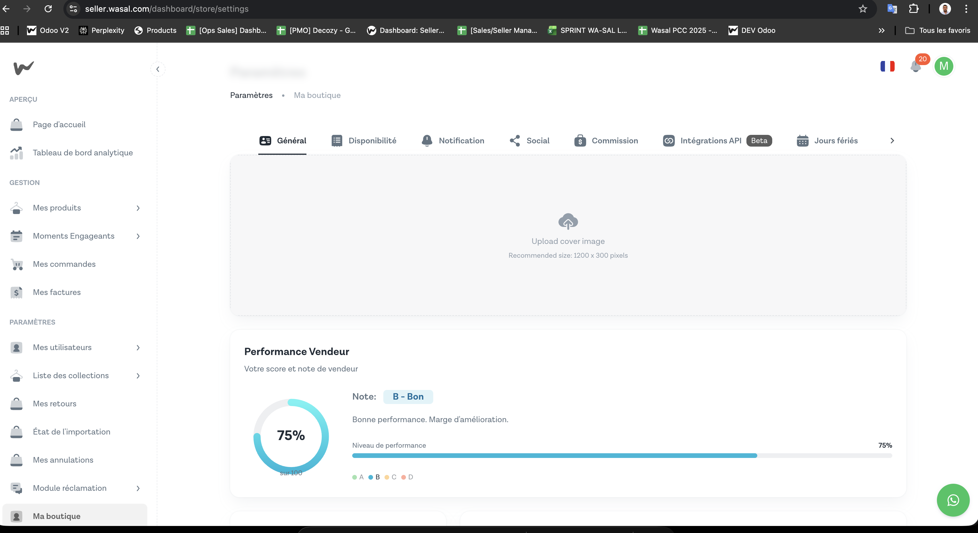 Depuis le Seller Portal, rendez-vous dans Ma boutique → Paramètres → onglet Général. L'encart Performance Vendeur se trouve en bas de la page.